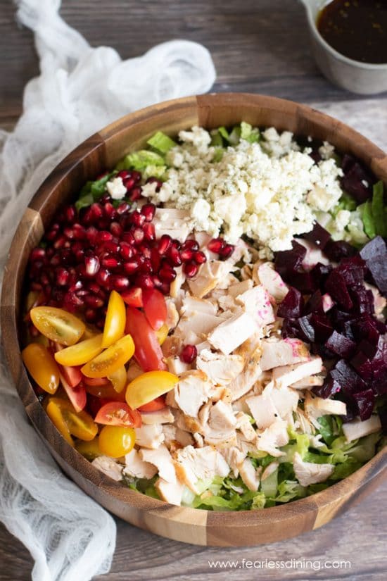 One bite of this savory chicken chopped salad and you will be hooked! Grilled chicken, romaine lettuce, beets, tomatoes, pomegranate, feta, and s ...